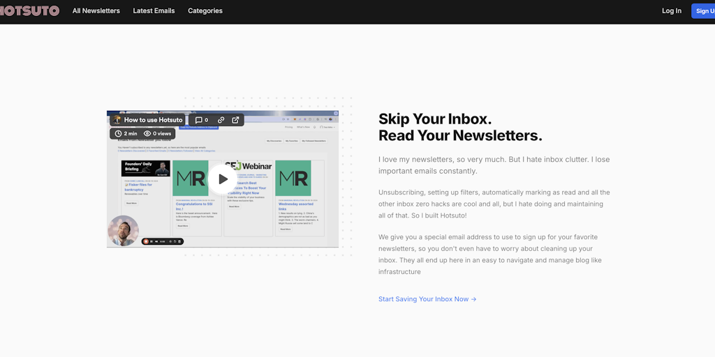 Hotsuto gives you a unique burner email to use to sign up for your favorite newsletters, so you don't even have to worry about cleaning up your inbox. They all end up here in an easy to navigate and m