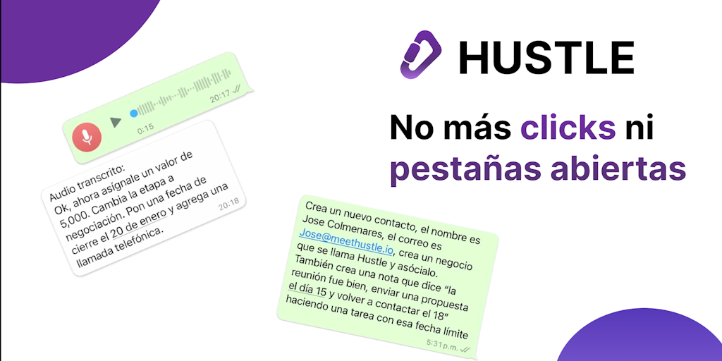 Delegate all operational CRM work to AI and with a single message, keep your pipeline updated! Give your team extra hours to continue selling. Hustle is the fastest experience for a clean and up-to-da