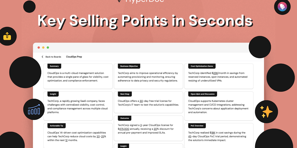 HyperDoc organises, summarises, and generates insightful flashcards for your sales pitch. Simply upload your sales documents and HyperDoc will do the rest.