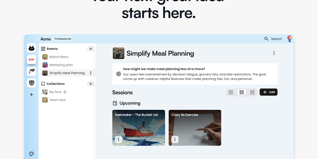Run smarter brainstorms, retros, and strategy sessions. Ideately brings structure, AI-guided flow, and clarity to creative thinking — one idea at a time. Built for real collaboration, not sticky note
