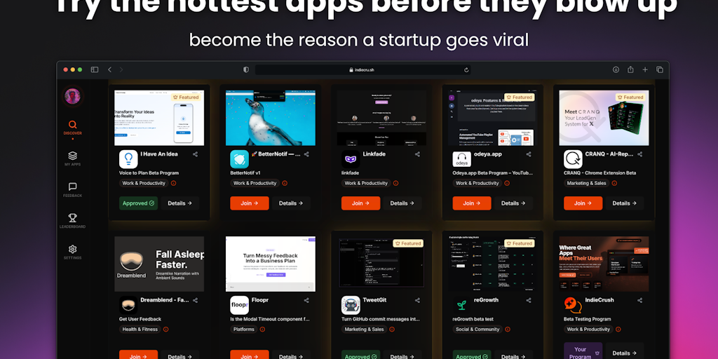 IndieCru.sh connects indie makers with real beta testers. Get feedback, first users, and testimonials before you launch. Powered by $indie, the token that rewards testers and boosts app visibility. Bu