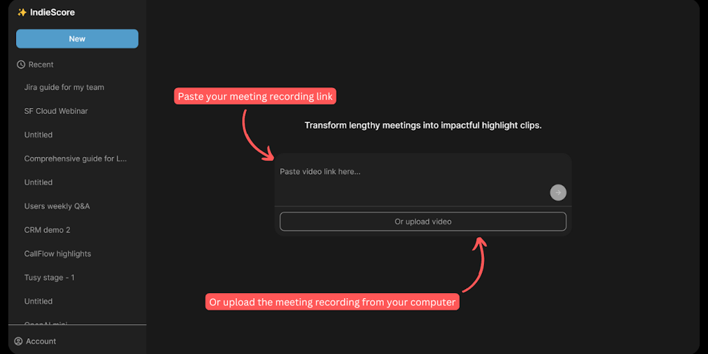 IndieScore transforms long meeting recordings into concise, shareable highlight clips, just like Loom. Upload your videos, and our AI extracts key moments, saving you time and keeping your team or cli