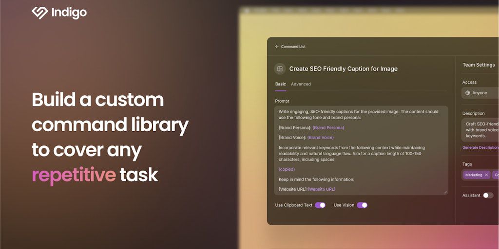 Indigo lets you deploy your own prompt library right where you work—no app-switching, no distractions 💪 Kickstart with our marketplace of ready-made commands and get more done, faster. Built for teams