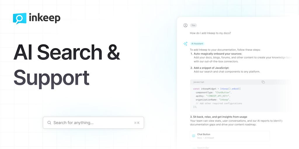 Inkeep makes it super easy to turn your docs and other content into a support copilot for your product. Just drop in a link and we take care of the rest. Use Inkeep as a search bar, "Ask AI" button, o