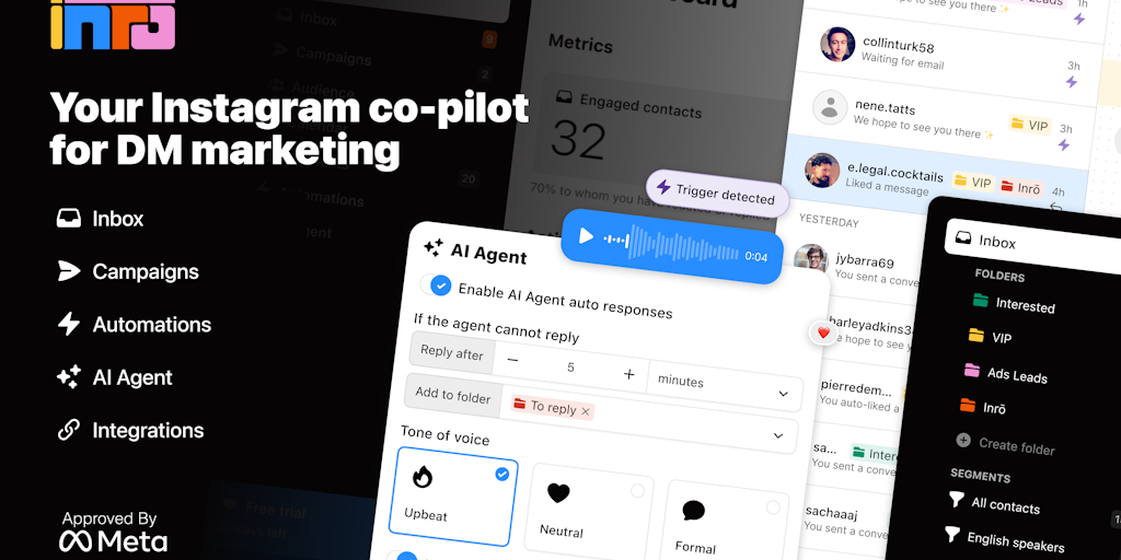 Meet Inrō, your Instagram marketing co-pilot. Automate engagement, send targeted DM campaigns, set up personalized AI agents, and integrate with your tools without code. Transform your Insta game and