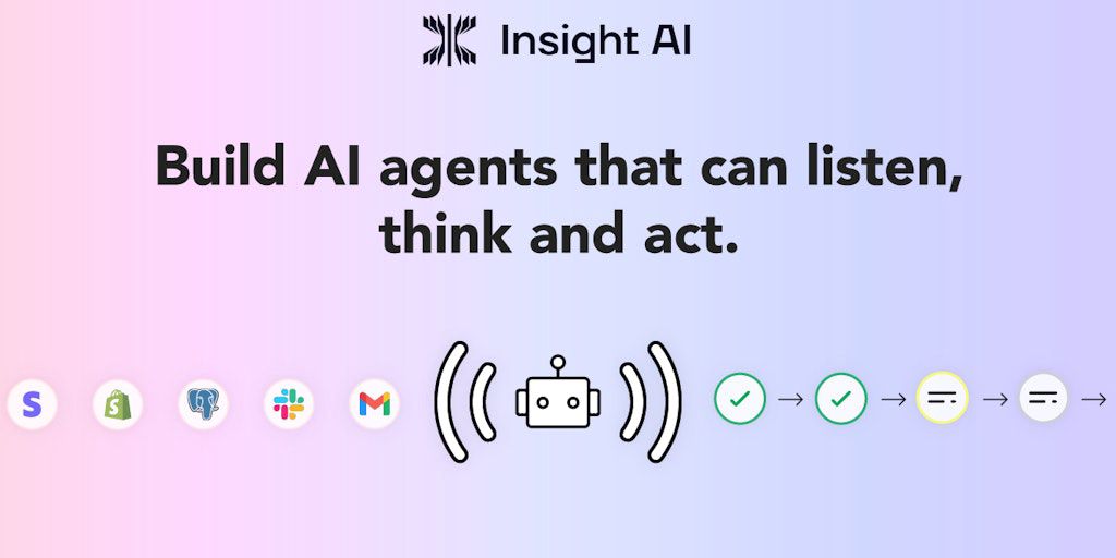 Insight AI helps you build AI agents that can listen for things you care about (a new email, a Slack post, a database row) and jumps into action on its own. No code, no formulas, no expressions—just d