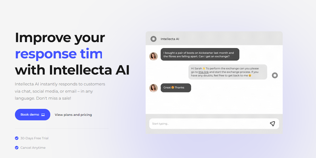Intellecta is trained on your company's data and uses GPT models to respond to customer inquiries across various platforms, such as chat, social media, and email. It's like having your own chat gpt.