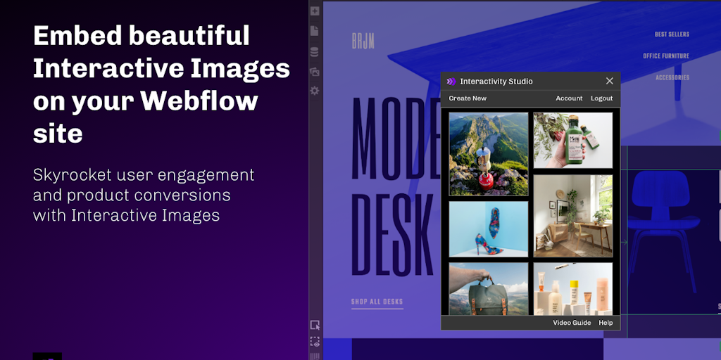 Interactivity Studio’s Webflow app helps you seamlessly embed interactive images on your Webflow site, allowing you to push the capabilities of creative storytelling and web design to a whole new leve