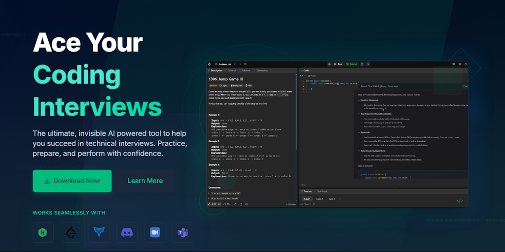 The ultimate, invisible AI powered tool to help you succeed in technical interviews. Practice, prepare, and perform with confidence.