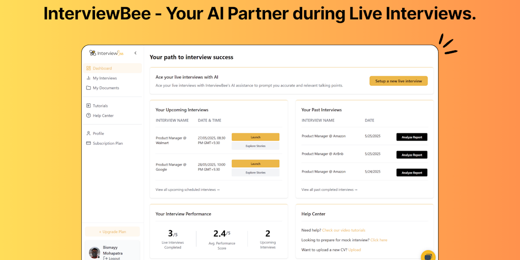 InterviewBee is your AI assistant that provides expert-level talking points in under 2 seconds during live interviews. 95% of users report significant confidence boosts, helping transform their interv