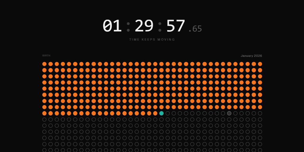 Most of us treat time as infinite. It's not. intnt shows your entire life as a grid of 1,080 months — from birth to ~90 years old. Each dot is one month. Set milestones and see exactly where they fit