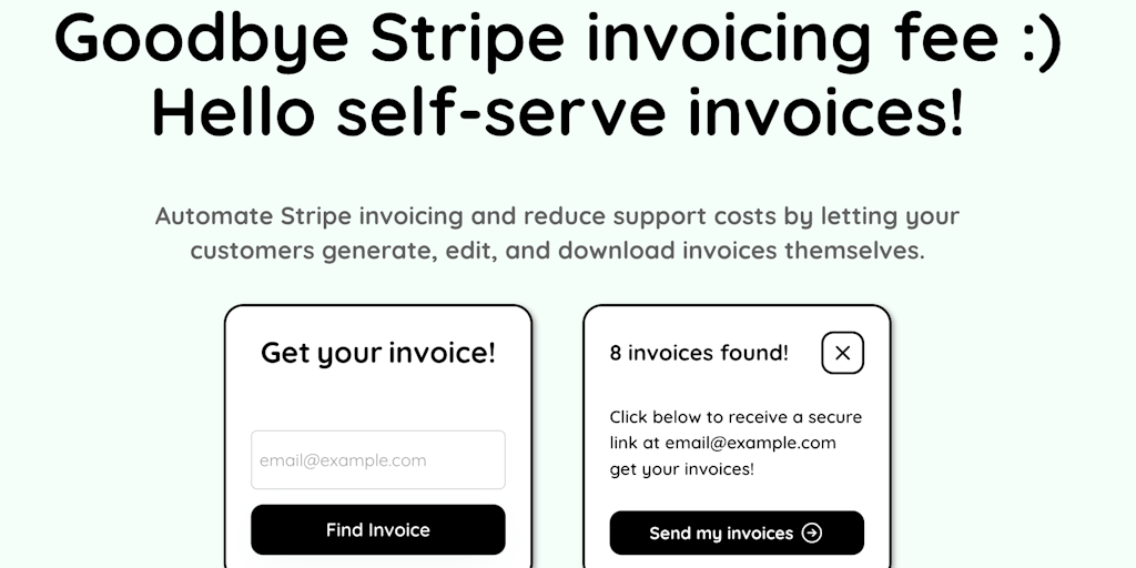 Invoya is a no-code solution to automate Stripe invoicing and reduce Stripe fees. Send a link to all your customers, where they can generate, edit, and download their invoices themselves so you don't