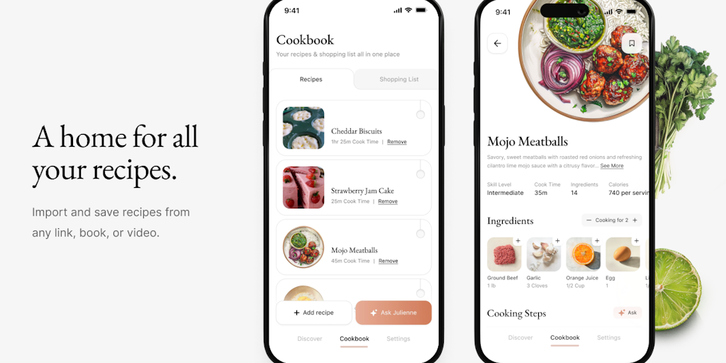 Import and save recipes from any link, book, or video. We capture cooking steps, ingredients, and more in seconds. Need some inspiration? See trending recipes or chat with Julienne for special request