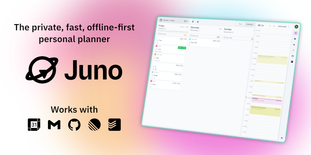 Juno is your personal productivity hub, helping high achievers plan, prioritize, and track progress. Auto-reschedule tasks, set due dates, estimate and log time, and avoid overload. Integrations with