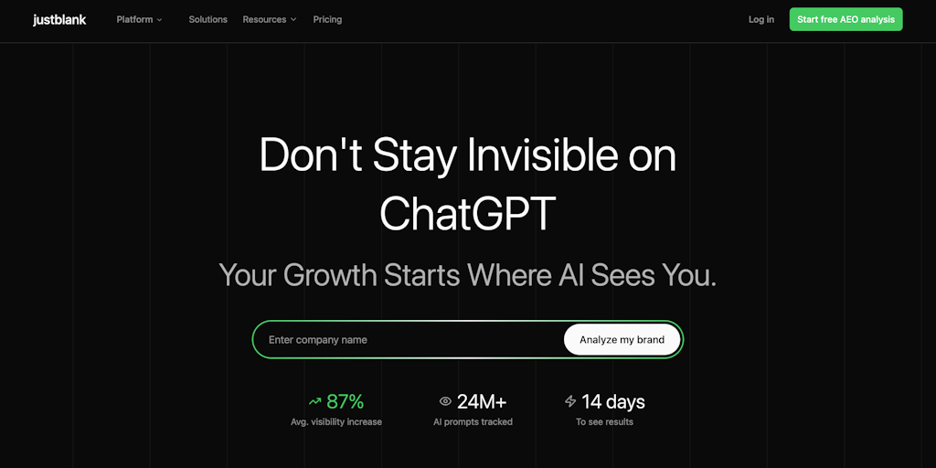 Justblank is a full-cycle AEO platform built for the AI search era. Start with free AEO analytics to see how AI engines understand and rank your brand inside AI answers. Track prompt visibility, compe