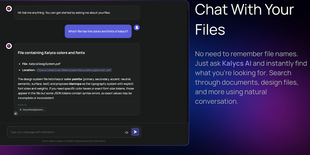Stop searching. Start finding. Kalycs keeps your files organized, finds anything fast, and turns documents into instant answers — all on your device.
