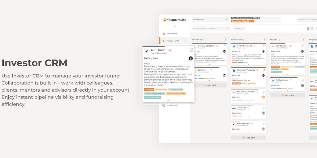 Foundersuite is an all-in-one platform that streamlines fundraising and investor relations for startups. Access a DB of 216,000 global investors, manage your pipeline using our CRM, send out your pitc