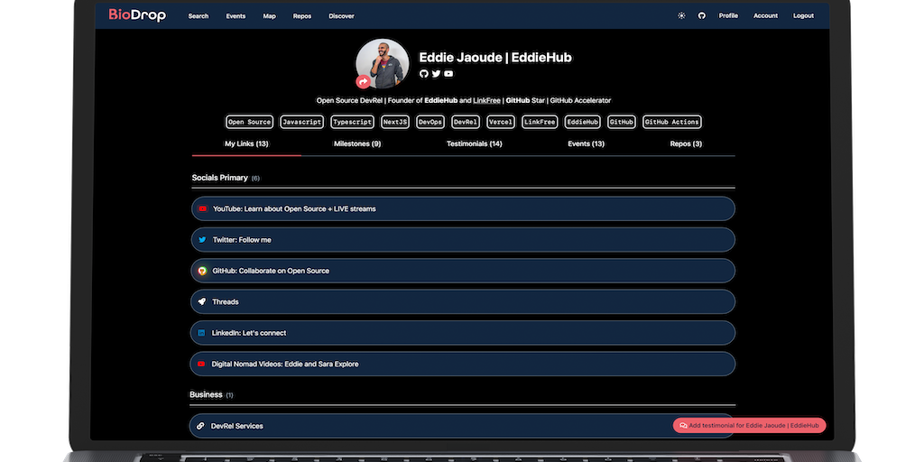 BioDrop is a platform where people in tech can have a single hub to showcase their content to accelerate their careers. Your profile will have links to your social media and content. You can also add