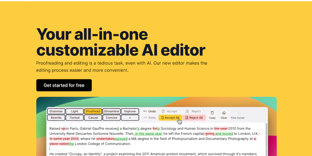 Your all-in-one customizable AI editor Proofreading and editing is a tedious task, even with AI. The new editor makes the editing process easier and more convenient. Use our pre-built editing prompts