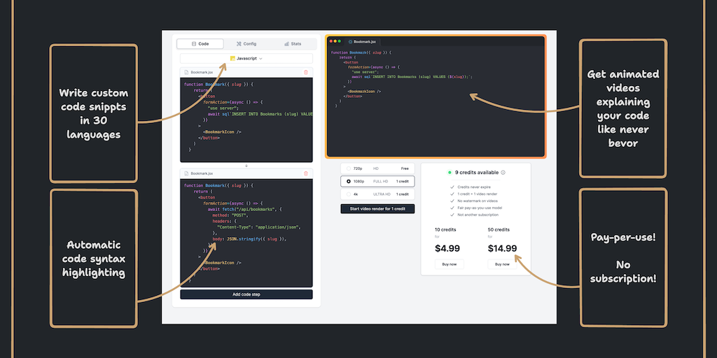 CodeBlinks is a tool for creating beautiful animated videos of your code. Use it to create tutorials, demos, and more. Get started for free.