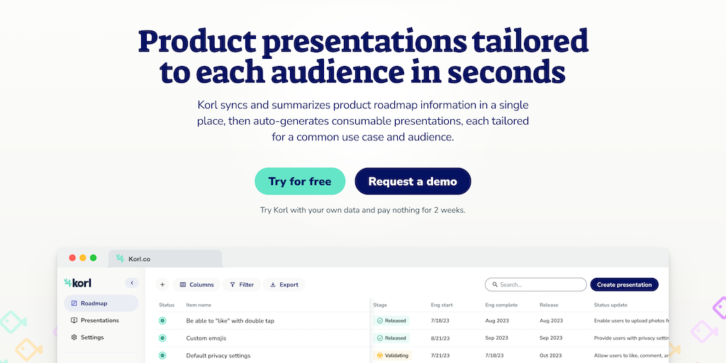 Korl syncs and summarizes roadmap information from detailed project data, then auto-generates consumable product presentations, each optimized for a common use case and audience.