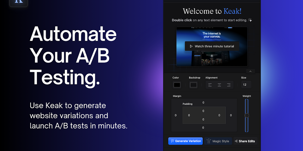 Keak enables websites to self-improve by using AI to generate website variations and then automatically launching A/B tests. When the tests reach statistical significance we use the data collected to