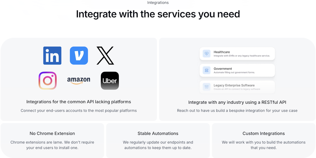 Keet provides APIs for any website. Developers use us to connect their customers' accounts and perform actions on their behalf.