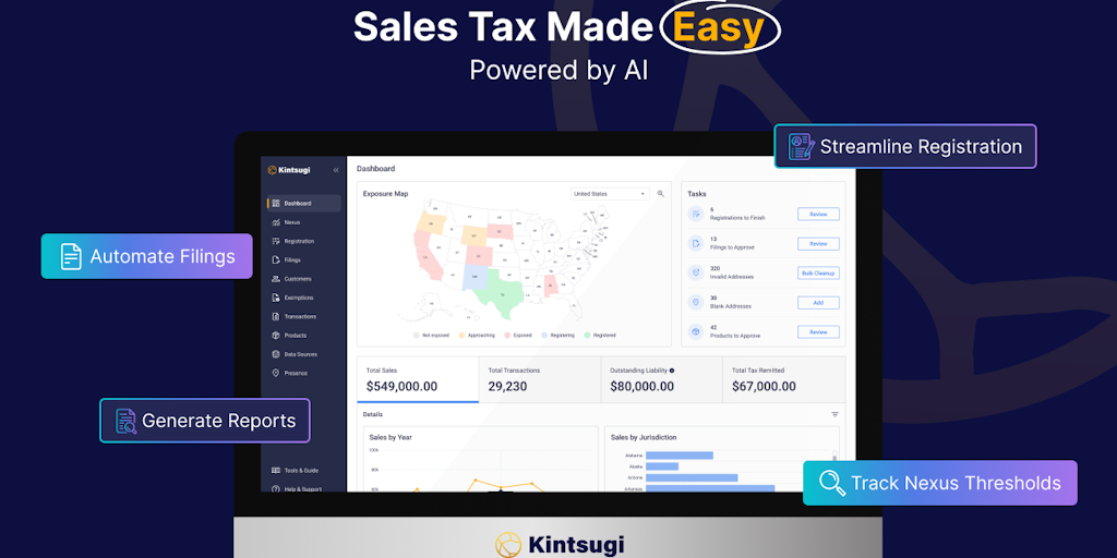 Kintsugi's AI-driven platform doesn’t just simplify sales tax; it transforms it. From precise tax calculations and real-time exposure monitoring to seamless filing and remittance, we automate the enti
