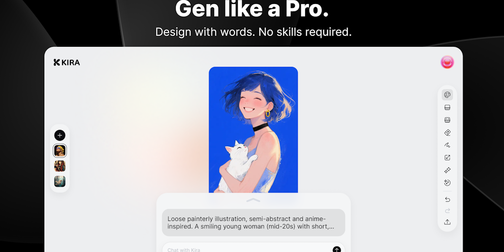 Kira is an AI agent for creativity. Describe your idea, get an image. Edit by talking. No prompts, no layers. Build for anyone with ideas, even if you’ve never made art before. Try it, test it, break