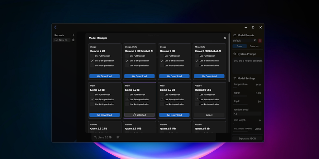 Open-source platform to train, download, and run LLMs on device. Kolosal is designed to be fast, lightweight, and sustainable. It’s only 20 MB in size, yet it can run LLMs just as quickly or even fast