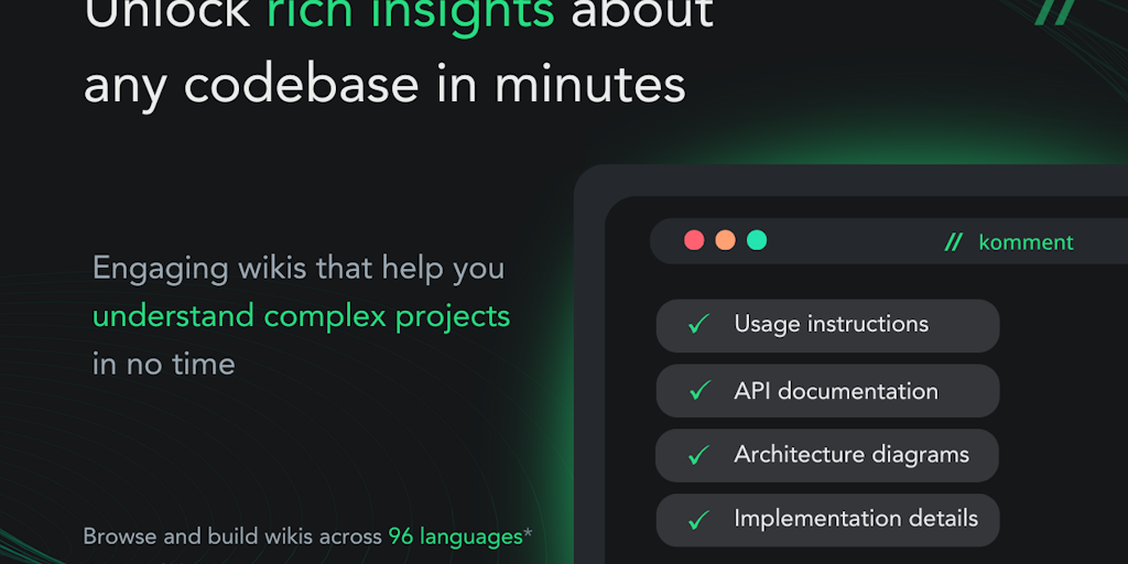 Struggling with messy code? Komment builds engaging self-healing wikis that unlock rich insights about any codebase in minutes. Speed up developer onboarding, simplify project handoffs, and confidentl