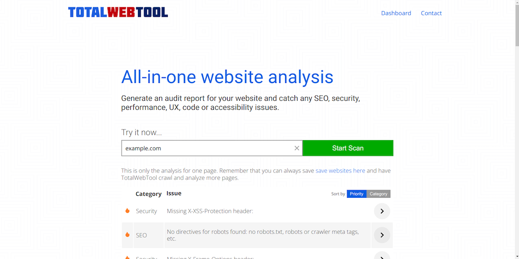 TotalWebTool is an all-in-one comprehensive website analysis solution that efficiently probes your site for SEO, performance, security, code quality, user experience (UX), and accessibility issues wit