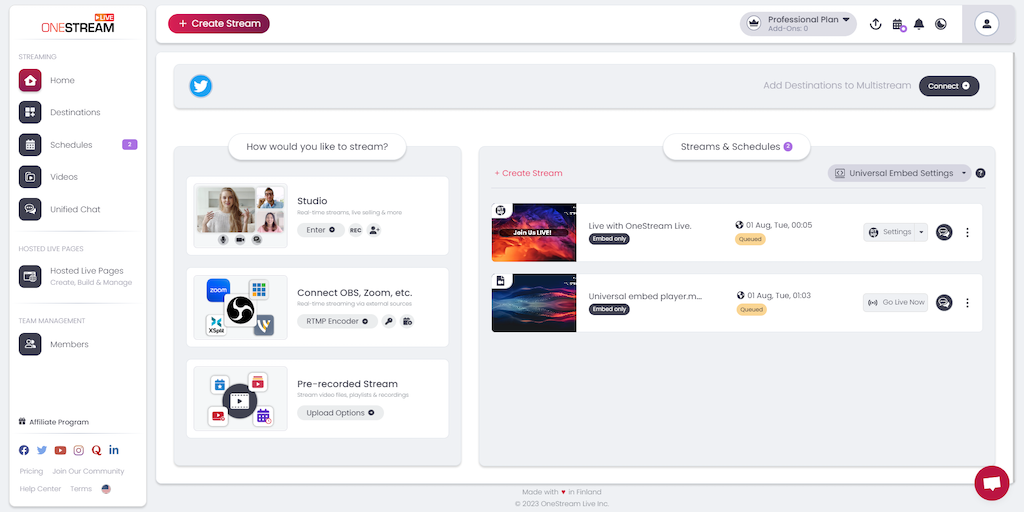 OneStream Live is a cloud-based live streaming solution to create, schedule and multistream real-time and pre-recorded videos on 45+ social media platforms, any custom RTMP destination, and the web al