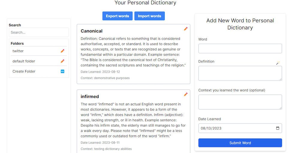 When learning a new word you can store it in your personal dictionary. Use generative AI to define words for you and match a multitude of terms outside the dictionary. Additionally, you can add contex