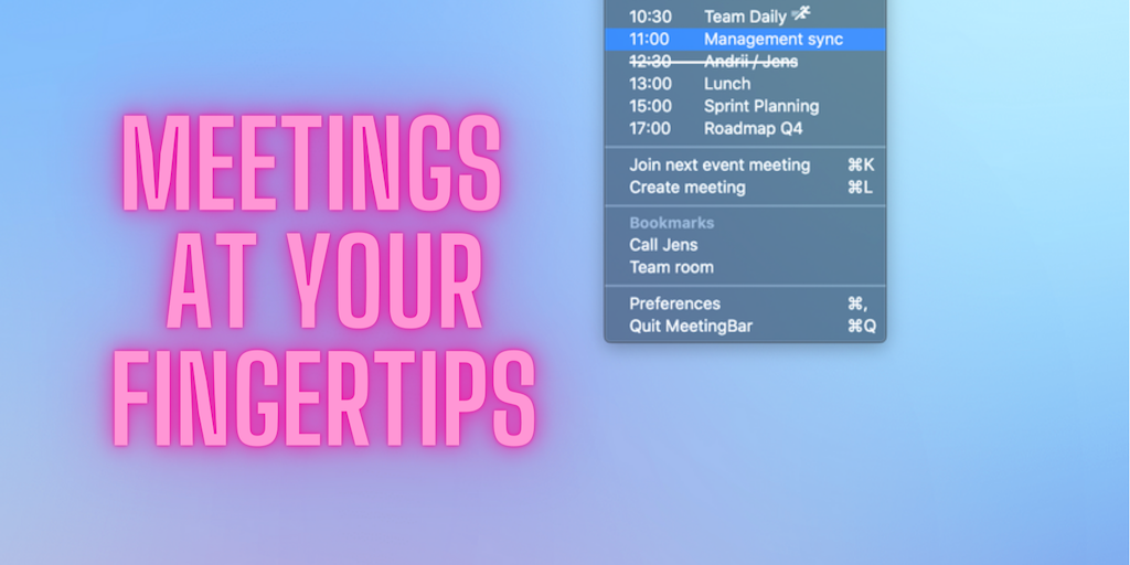 MeetingBar shows your calendar events in the status bar. Create and join meetings in one click. Now with a Google Calendar direct integration! No data or personal information collection. The app is fr