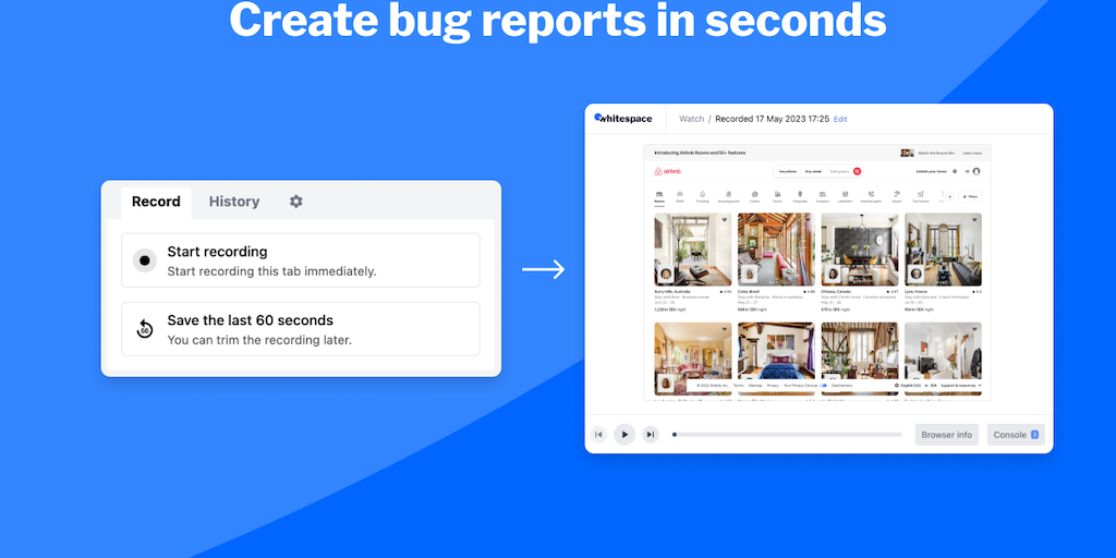 Whitespace let's you create a bug report in seconds by recording everything that happens in a tab and create a sharable and replayable link to the video. Each video contains a screen recording and any