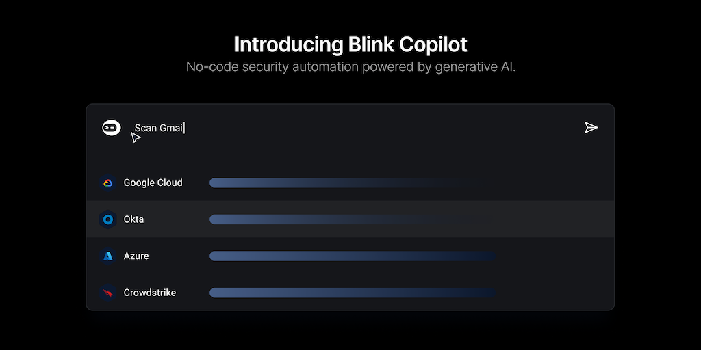Blink Copilot makes it possible for any security operator to generate no-code workflows using a simple prompt. Effortlessly automate your security workflows using Blink Copilot's generative AI and lib