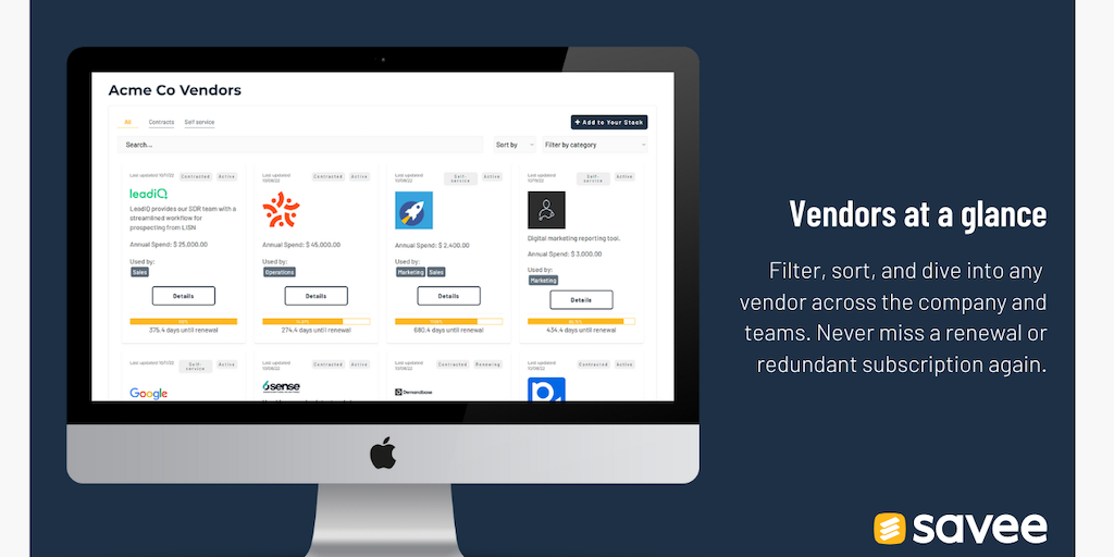 Savee is a startup-friendly platform that helps businesses buy and manage vendor contracts. It identifies vendor overlaps and potential compliance issues while uncovering cost savings and managing the