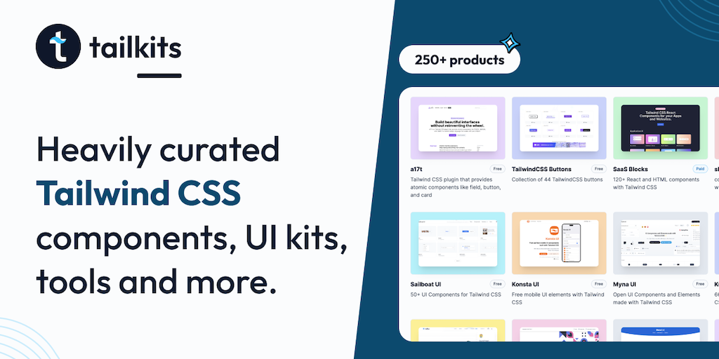 Tailkits is a curated library of components, kits, tools, resources, and landing page inspirations that will help you build projects with Tailwind CSS faster. Discover 250+ hand-picked products, and s