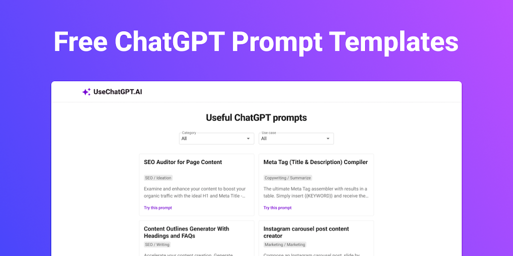 Boost your productivity with free ChatGPT prompts for SEO, Marketing, Copywriting, and more, curated by our expert prompt engineers.