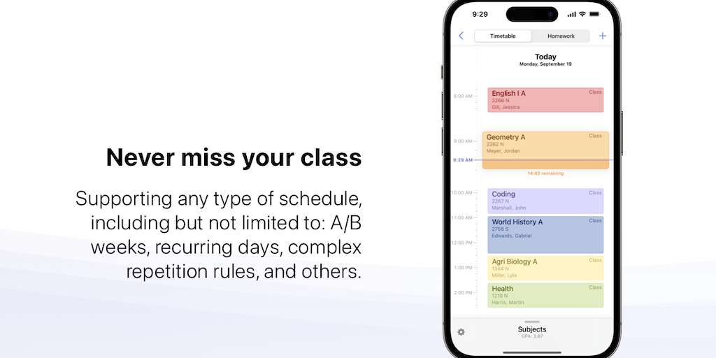 Subjects is an app for students to track timetables, homework, and grades. While having a simple and minimalistic UI, under the hood, it is packed with advanced features to deal with complex schedules