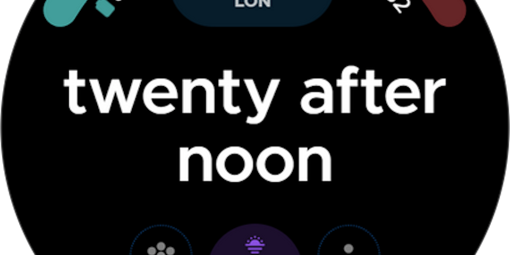 This bespoke watchface has been handcrafted with an easy-to-read "fuzzy" text readout in 5-minute increments. The face shows upcoming events, heart rate, and 3 customizable complications and 2 shortcu