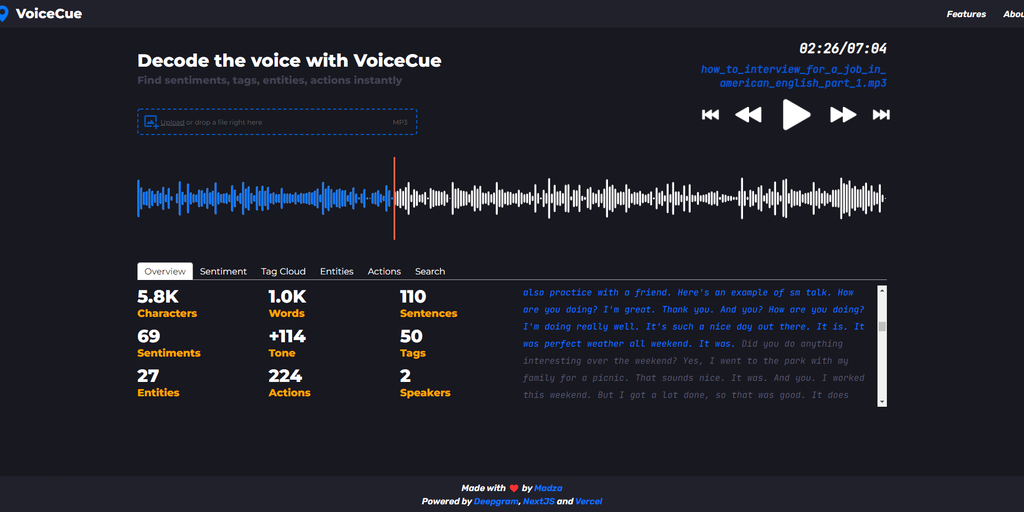 VoiceCue generates cue timecodes that lets you find all the important parts of your voice recordings like sentiments, entities, and tags with just a click.