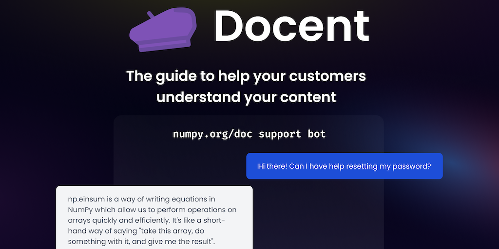 Don't have a chatbot? Now you do! In 20 seconds, we'll build your company a virtual assistant by scraping your website + documentation. Docent resolves questions for customers, employees, and even tec