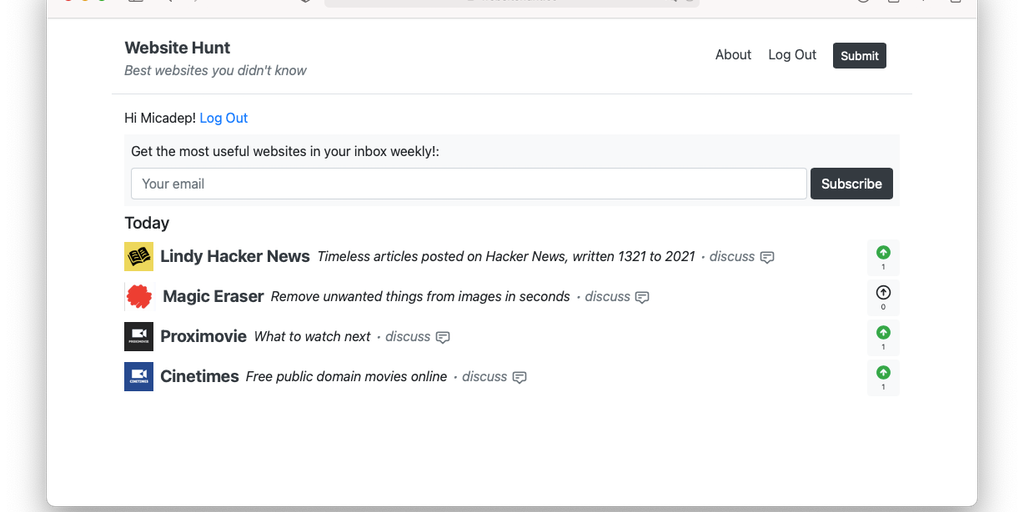 Subscribe to the newsletter to receive the best most upvoted websites, each week. Or submit one. Free or paid, the rule is that it has to “stand alone”. It generally cannot be a landing page or some w