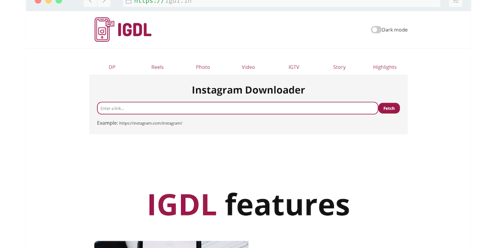 IGDL is an tool to help you with downloading Instagram DP, Reels, Photo, Video, IGTV, Story & Highlights. It's easy to use on any device, mobile, tablet, or computer.