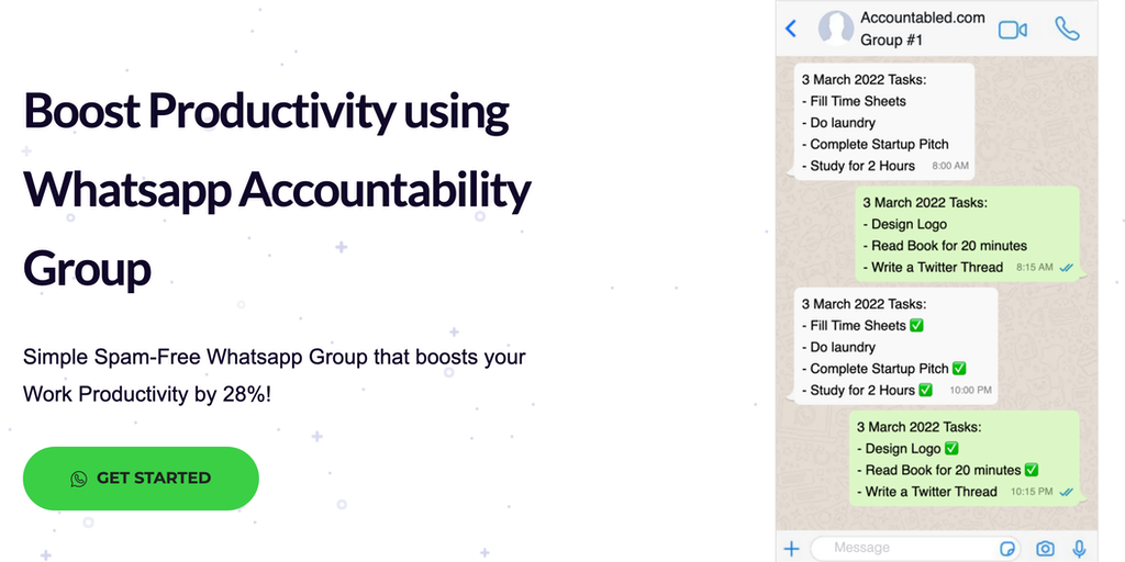 Acountabled.com is a platform that provides social accountability using Whatsapp Group. The idea is to post daily to-do list in the morning and record your progress in the night publically which ensur