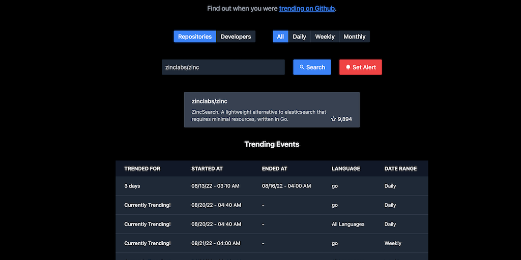 Historically see when your repository or username was on Github Trending, and get alerted when they get trending in the future.