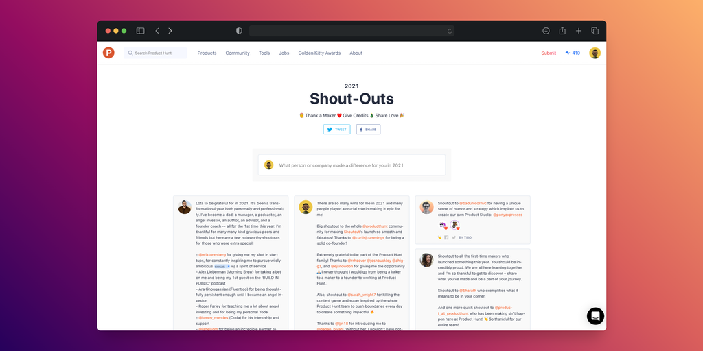 2021 Shout-Outs - Time to show love to your fav makers and products from 2021 | Product Hunt