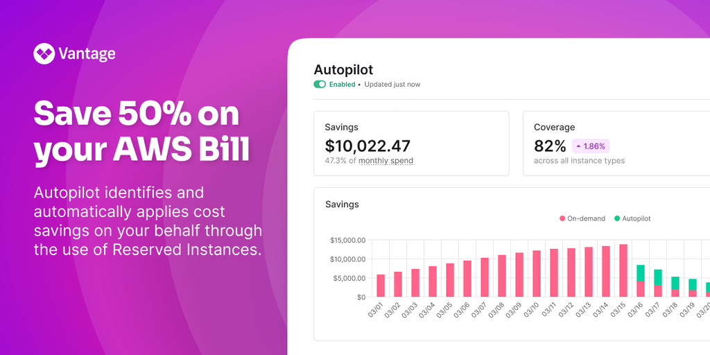 Save 50% on your next AWS bill. Vantage Autopilot applies cost savings on your behalf by automatically buying and selling Reserved Instances. There are no upfront commitments or infrastructure changes